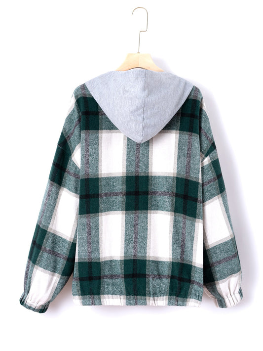 Elengatine Plaid Print Drop Shoulder Zip up Hooded Coat