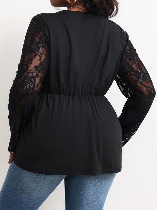 Elengatine Plus Solid V Neck Drop Shoulder Lace Sleeve Top